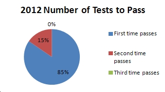The national pass rate for first time passes is considerably lower. The charts below show how many tests it has taken to pass for students who have passed their tests with PHD. In 2012, 22 people passed on their first test, 4 on their second test - Nobody took more than 2 attempts!